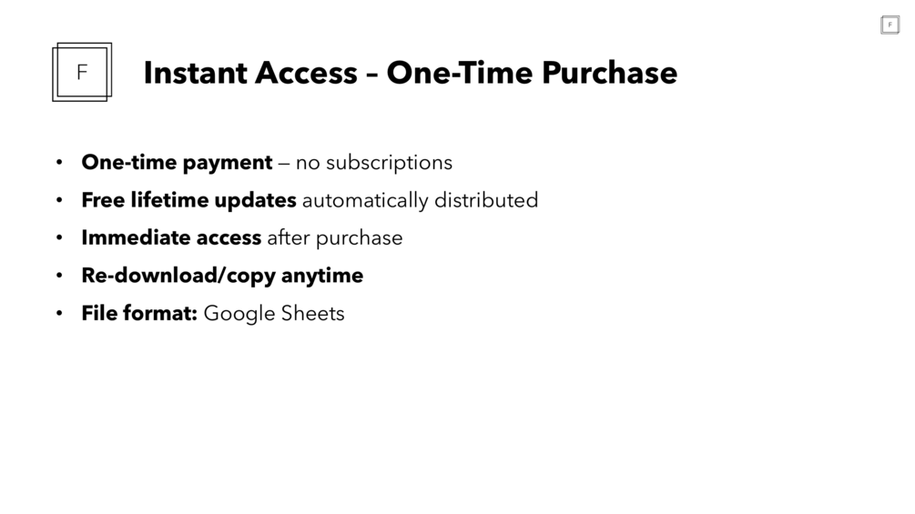 Once your payment has cleared, you’ll be able to download your files instantly via Etsy. A PDF with direct links to the Google Sheets product. Detailed instructions are provided to help you get started right away.