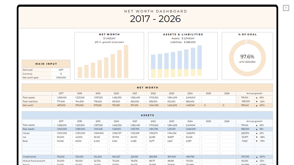 Stay on top of your finances with this easy-to-use Net worth tracker spreadsheet. Track your assets and liabilities each year, and let the spreadsheet calculate your total net worth automatically. With built-in charts and a simple layout, monitoring your financial progress has never been easier!