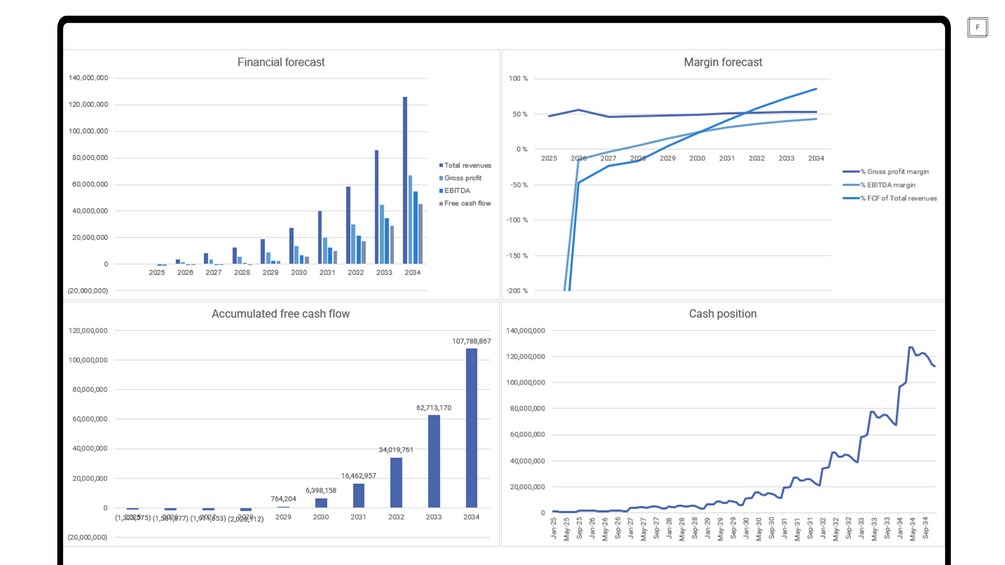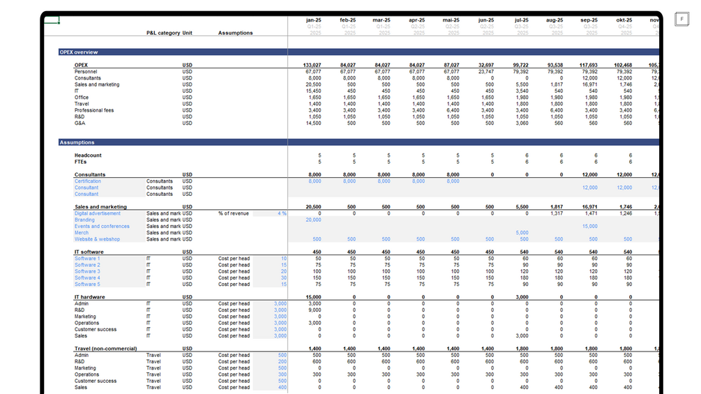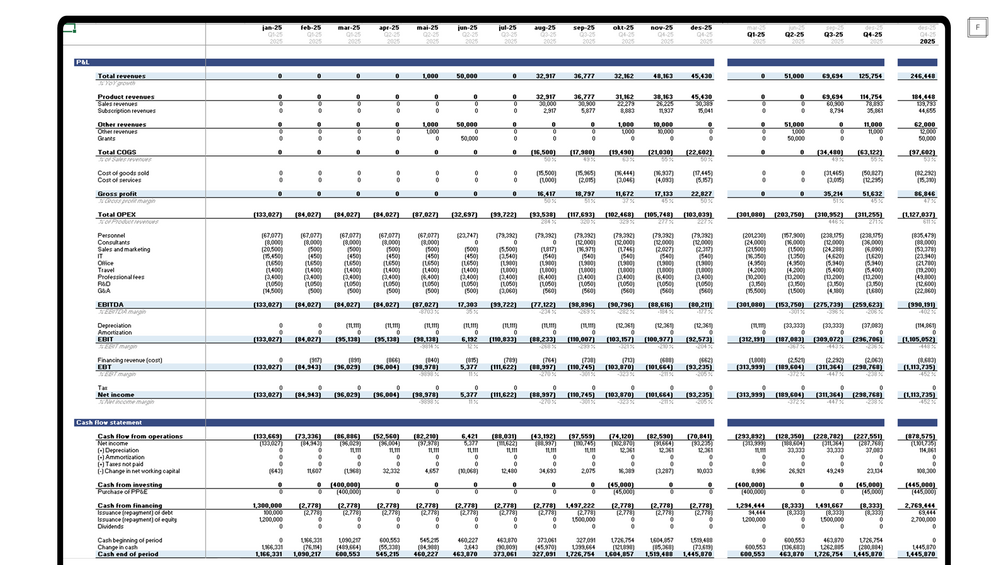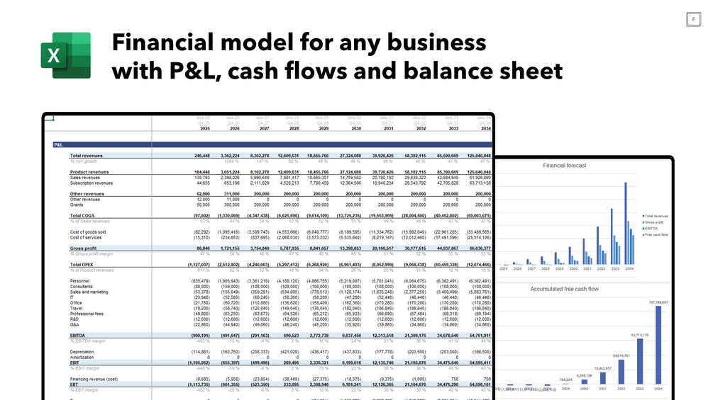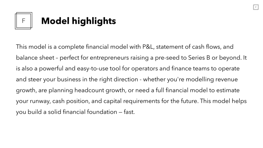 This model is a complete financial model with P&L, statement of cash flows, and balance sheet – perfect for entrepreneurs raising a pre-seed to Series B or beyond. It is also a powerful and easy-to-use tool for operators and finance teams to operate and steer your business in the right direction - whether you're modelling revenue growth, are planning headcount growth, or need a full financial model to estimate your runway, cash position, and capital requirements for the future. This model helps you build a solid financial foundation — fast.
