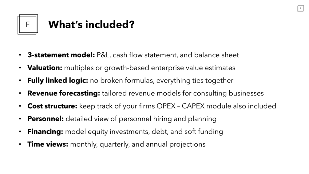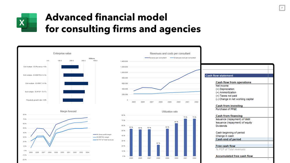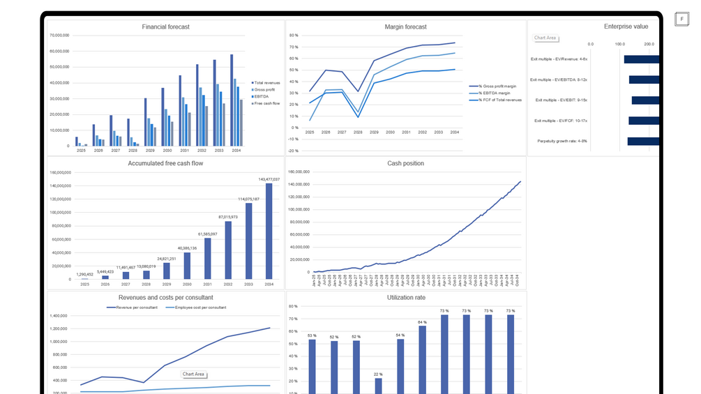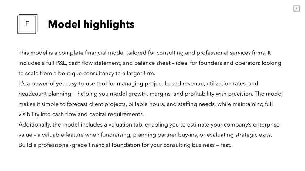 This model is a complete financial model built specifically for consulting and professional services firms. It includes a full P&L, cash flow statement, and balance sheet – perfect for founders and partners who want to grow a profitable and scalable firm. It’s a powerful and easy-to-use tool for planning headcount, managing utilization, forecasting project revenue, and understanding your margins and cash position. Whether you’re modelling client growth, planning new hires, or estimating your runway and capital needs, this model helps you make data-driven decisions fast. Additionally, the model includes a valuation tab, allowing you to analyze the enterprise value of your firm – a valuable tool when fundraising, planning partner buy-ins, or exploring strategic exits. Build a professional-grade financial foundation — fast.