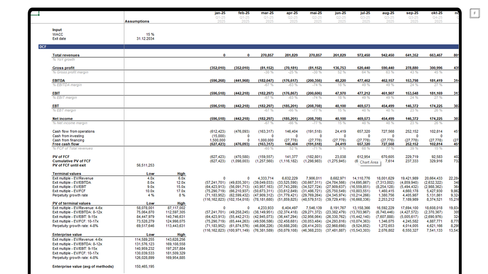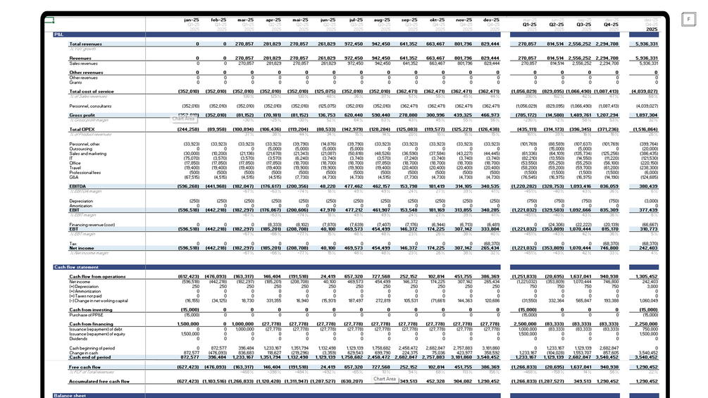 - 3-statement model: P&L, cash flow statement, and balance sheet