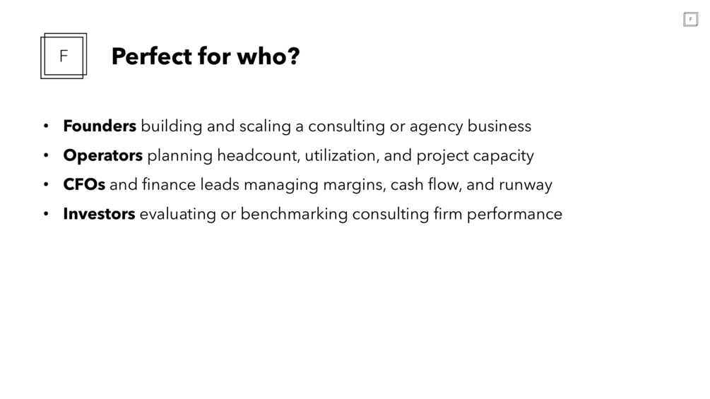 A: Yes – this model has been used in real fundraises and internal financial planning for consulting and professional services firms.