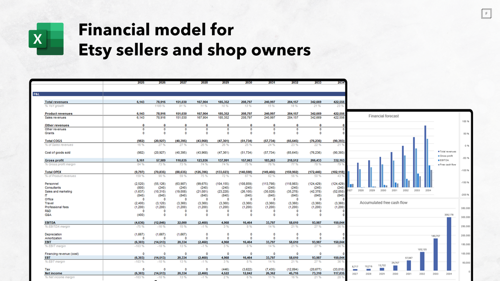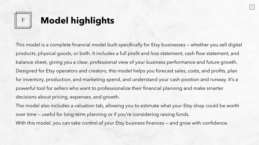 This model is a complete financial model built specifically for Etsy businesses — whether you sell digital products, physical goods, or both. It includes a full profit and loss statement, cash flow statement, and balance sheet, giving you a clear, structured overview of your shop’s performance and future growth.