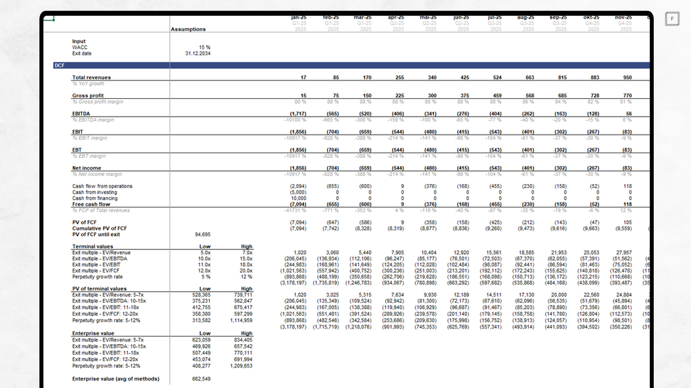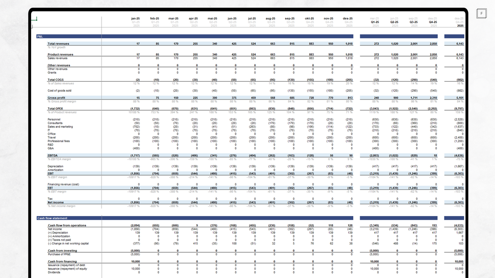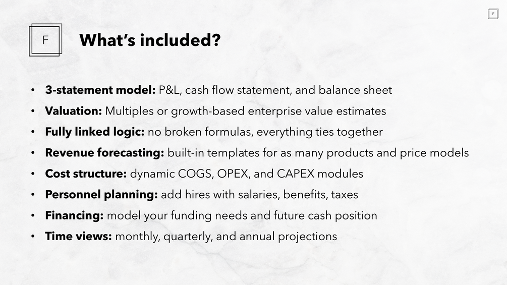 - 3-statement model: P&L, cash flow statement, and balance sheet
