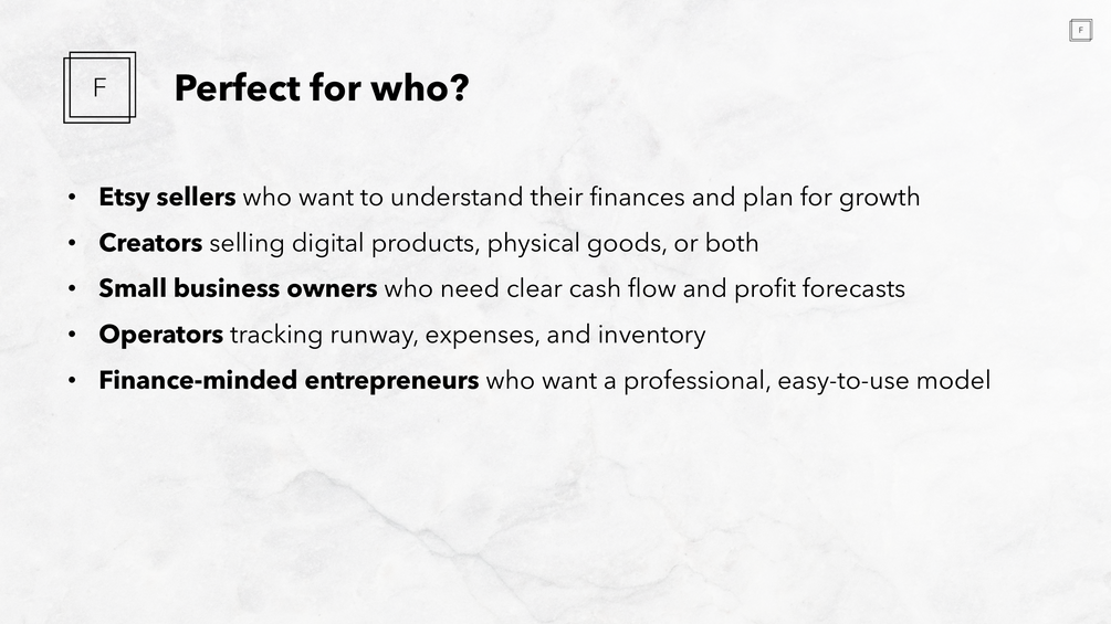 Designed for Etsy operators and creators, this model helps you forecast sales, costs, and profits, plan inventory, marketing, and headcount, and understand your cash position and runway. It’s perfect for sellers who want to manage their shop like a business — with clarity, confidence, and control.